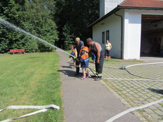 Doch wir können mehr als nur löschen! Unsere zusätzlichen Aufgaben beginnen schon mit unseren kleinsten Bewohnern im Ort - wir besuchen regelmäßig den Kindergarten und die Schule und unterrichten die Kinder im Bereich Notfall und Feuer. Die einfachen theoretischen Regeln ergänzen wir mit praktischen Übungen und schon ist ein Vormittag mit viel Spaß gefüllt! Ergänzend dazu gibt es im Sommerferienprogramm immer einen Nachmittag bei der Feuerwehr - auch hier zeigen wir den Kindern gerne die Aufgaben, Geräte, Fahrzeuge und unser Feuerwehrgerätehaus. Die Badebekleidung wird an solch einem Nachmittag selbstverständlich gewünscht und auch gebraucht! Wasser marsch!