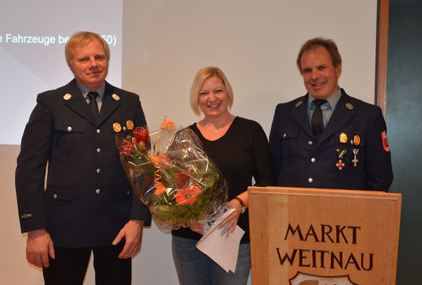 Andrea Fuchs mit 1. Kommandant Xaver Rist und 1. Vorstand Manfred Geist.